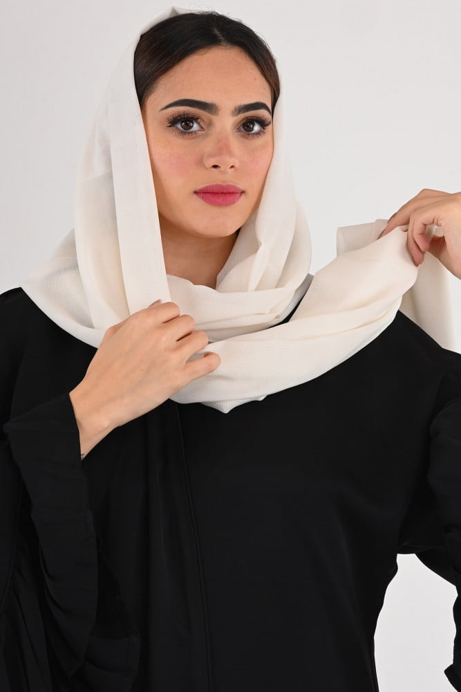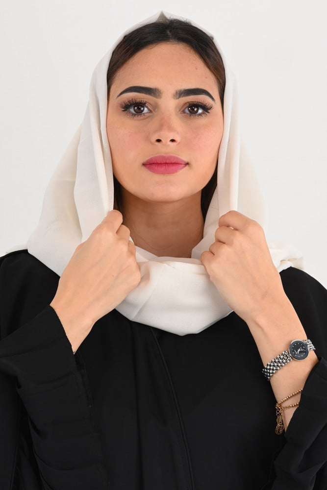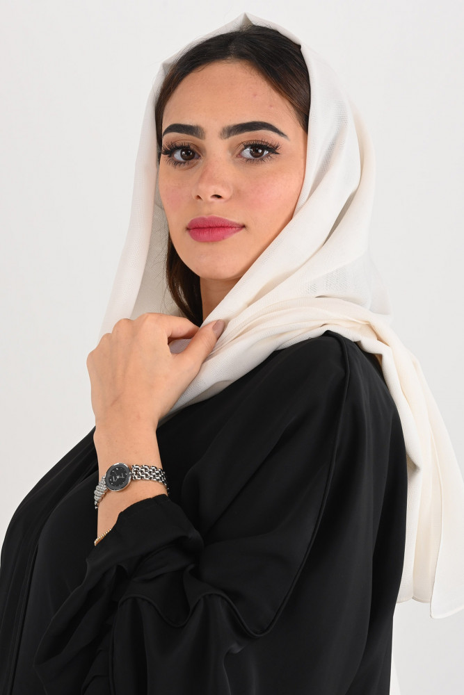 - وصف الموديل: طرحة لون بيج مقلم من نفس القماش
