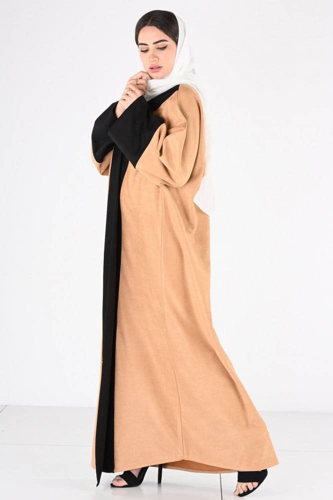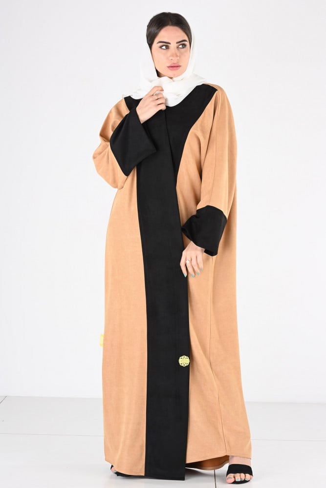 - وصف الموديل: عباية بطرحة لف بقماش شامواه بلون جملي دارج بالون الاسود
