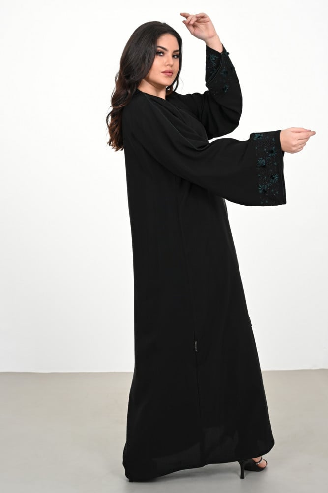 • وصف الموديل; عباية بطرحة ازرار بتطريز خرز اسود وشغل مخملي بالون الفيروزي بلمسه ناعمه بالكم