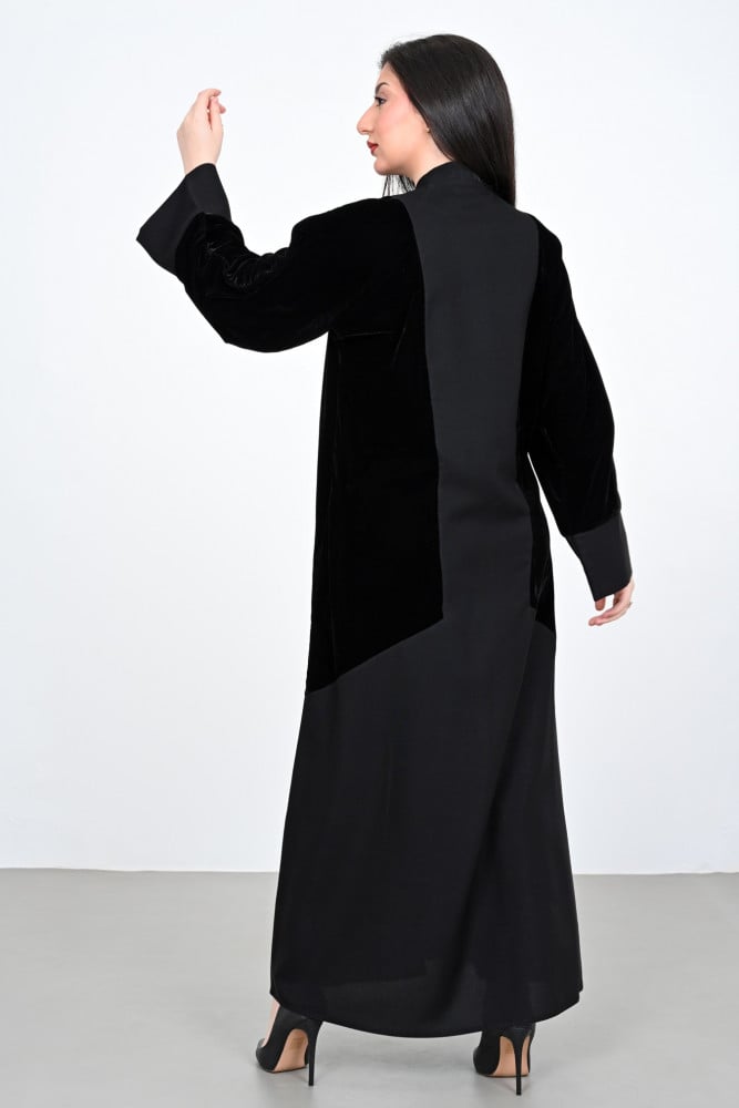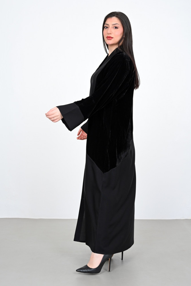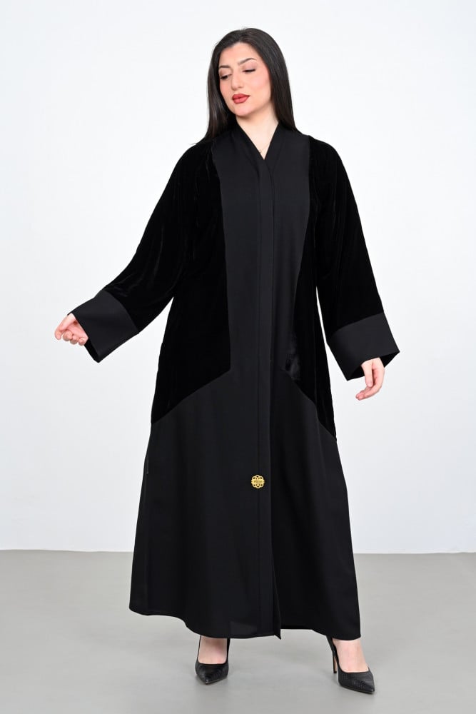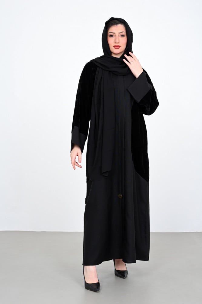 وصف الموديل; عباية بطرحة ازرار مطعمة بمخمل بالأمام والخلف