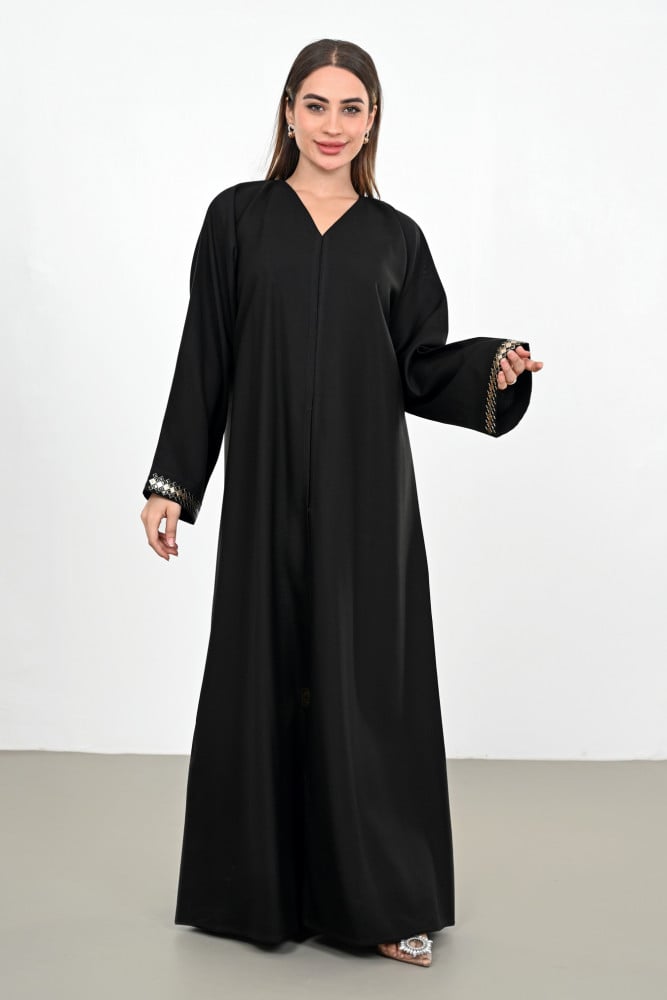 - وصف الموديل; عباية بطرحة ازرار برواز بالأمام كرستال ناعم بالكم