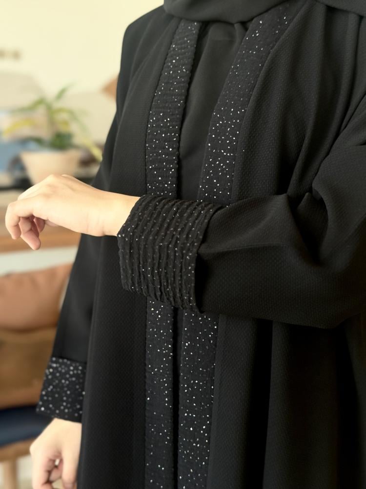 الوصف : عباية بطرحة لف لماع من الامام وعلى الاكمام