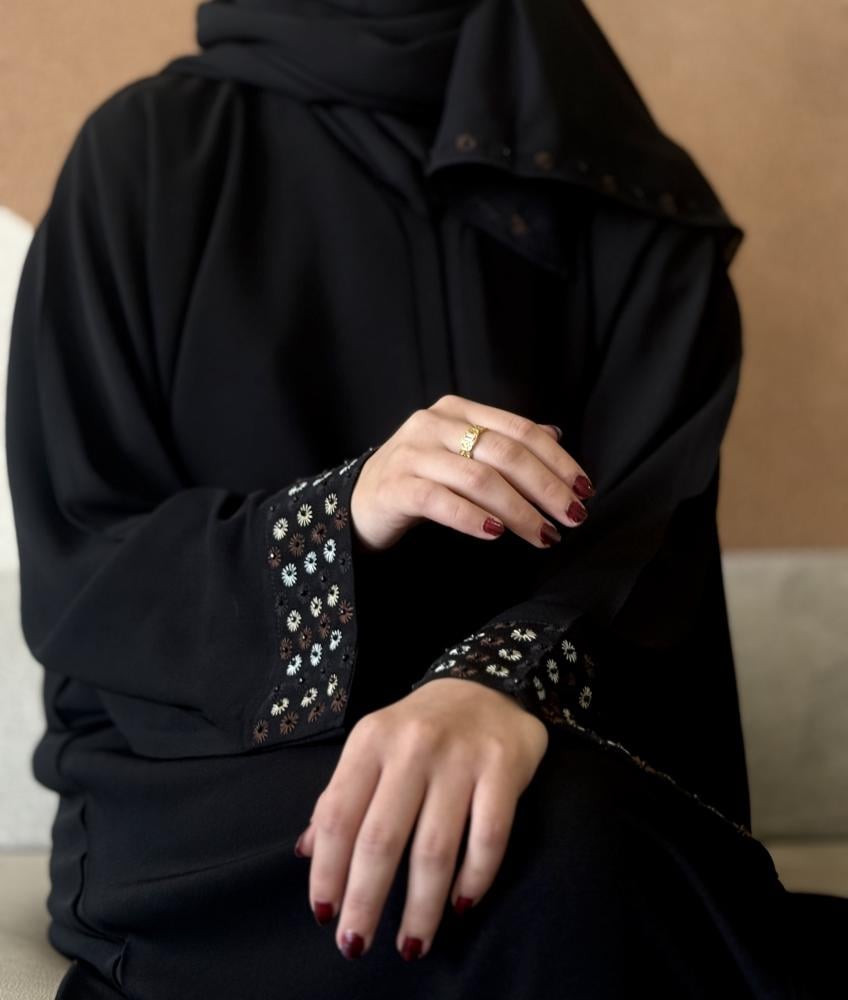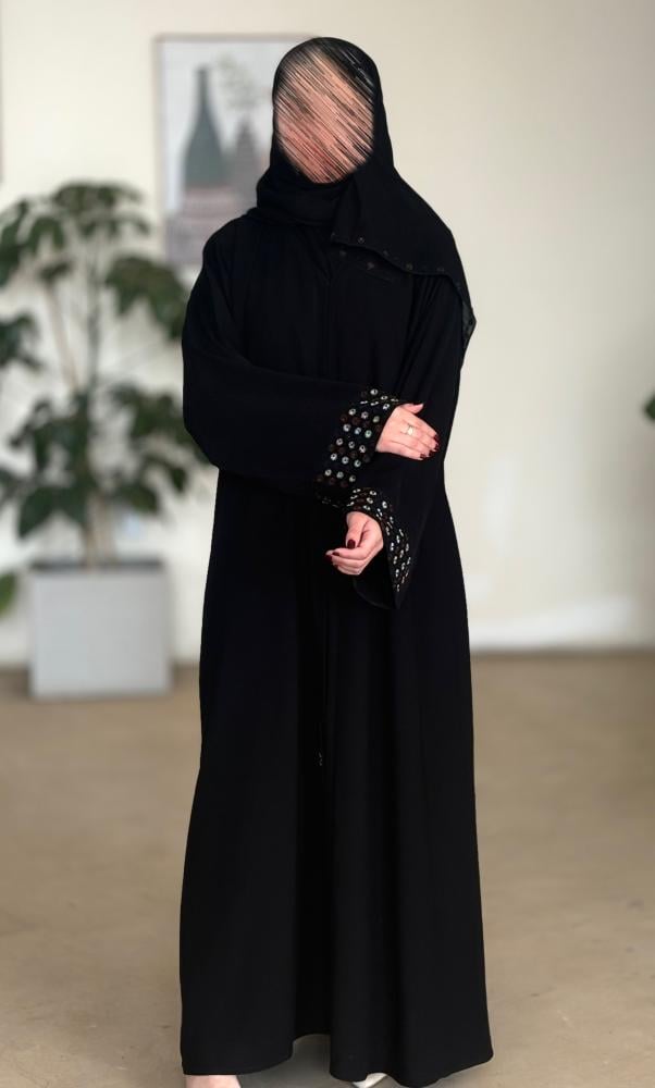 الوصف :عباية بطرحة زرارات تطريز في الاكمام