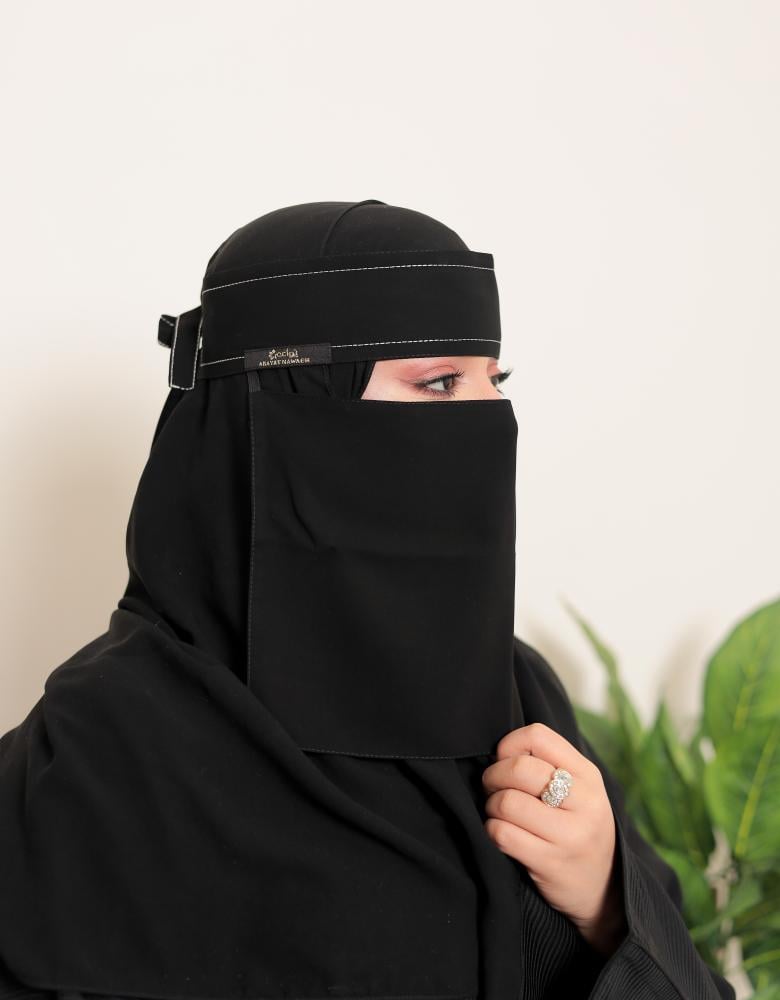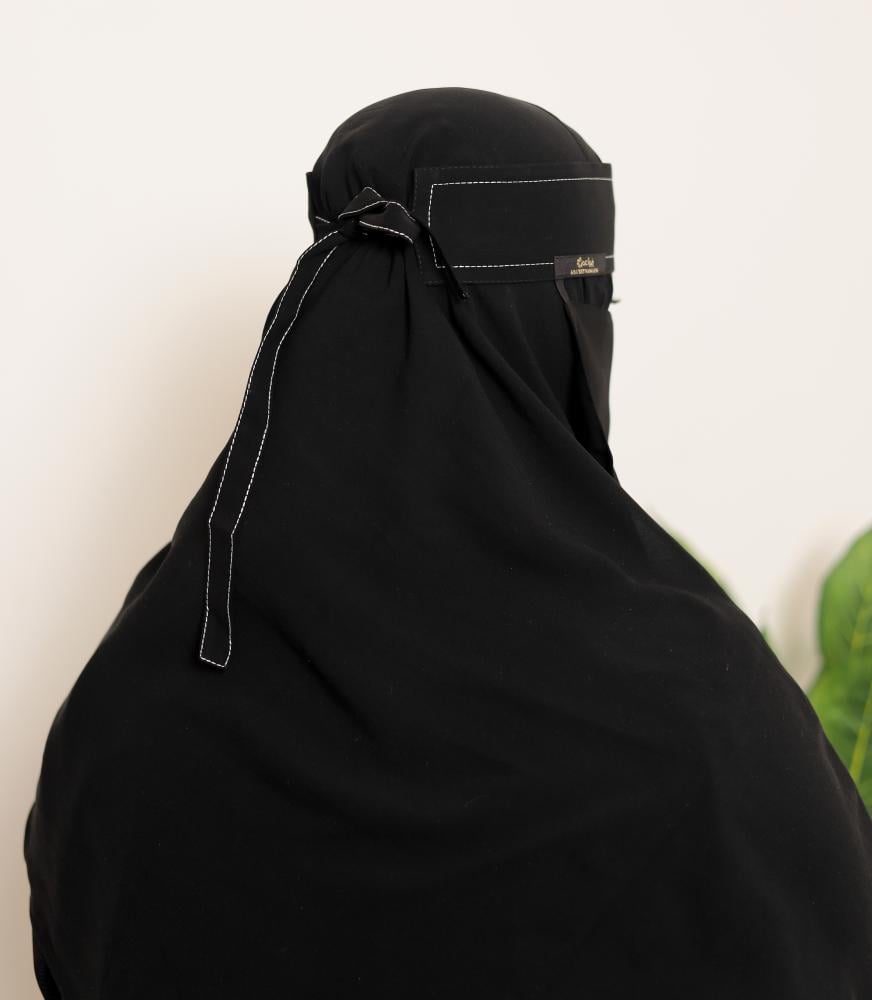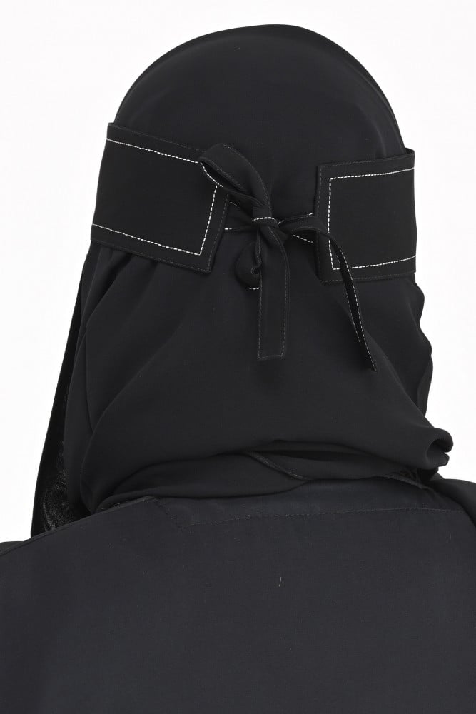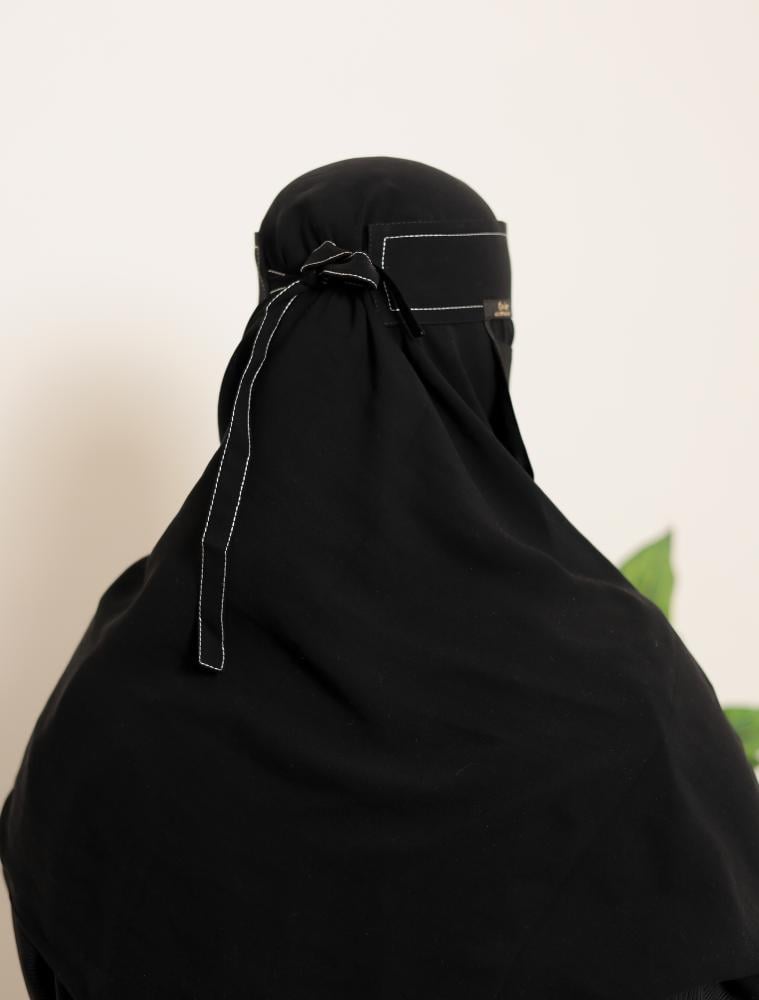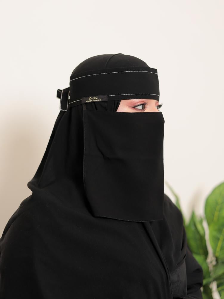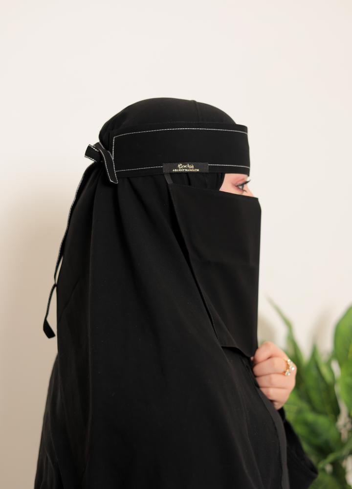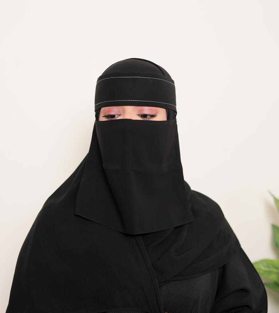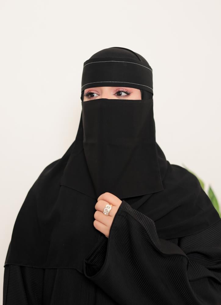 • وصف الموديل: نقاب مغاط قصير بخطين تطريز الي نهاية الربطة