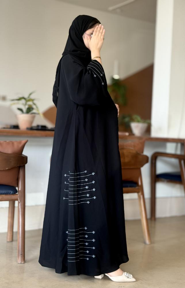 الوصف : عباية بطرحة زرارات تطريز مكينة مع كرستال على الاكمام والجنب