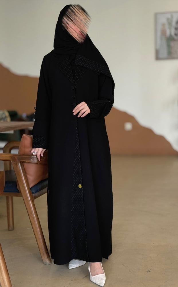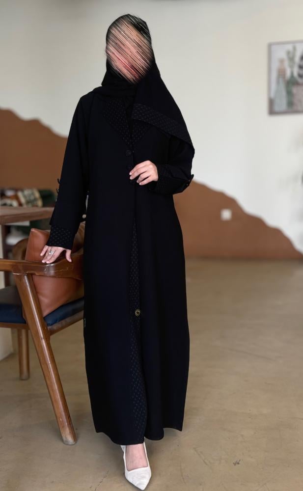 الوصف : عباية بطرحة زرارات مفنوح من الاسف مع ياقة كم دبل كبك مع زرارات
