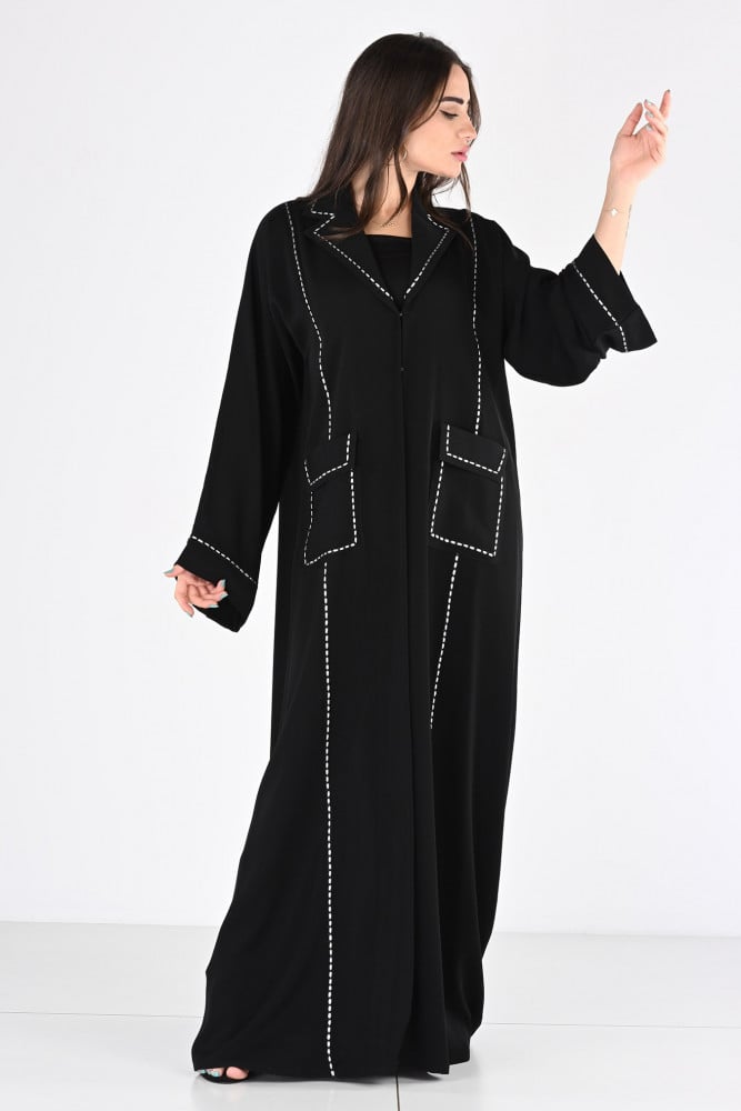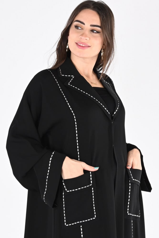 - Model description: An abaya with a flap veil, two buttons in the front, with pockets defined in blue color