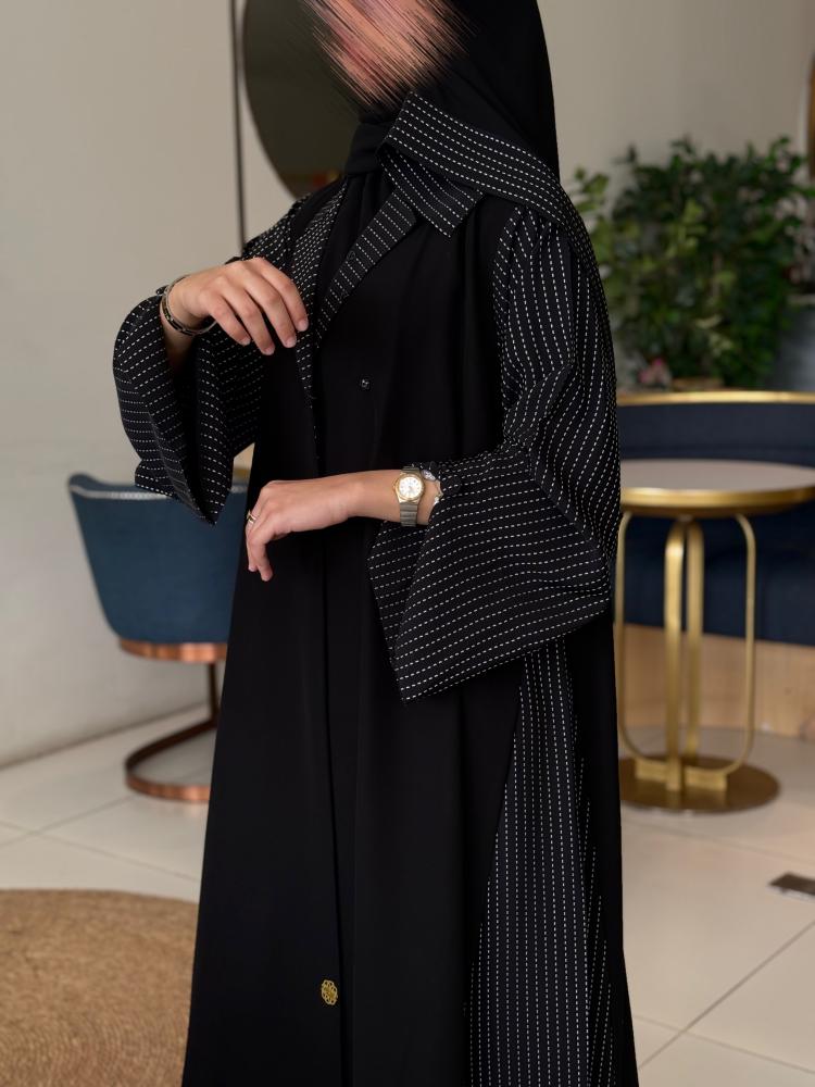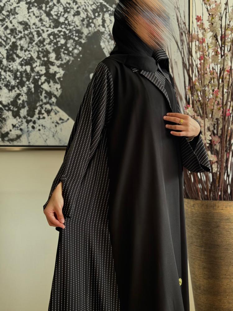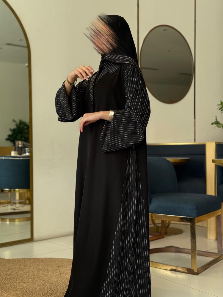 - وصف الموديل: عباية زرارات نص مع ياقه مع قماش منقط في الكم والجوانب