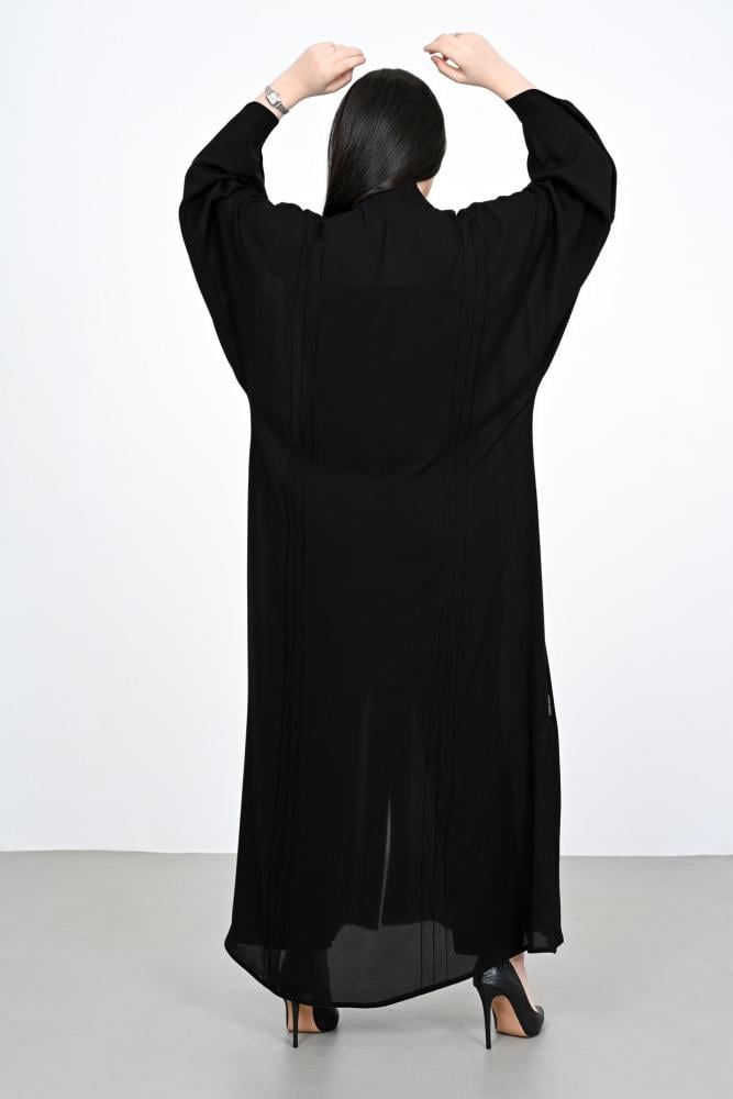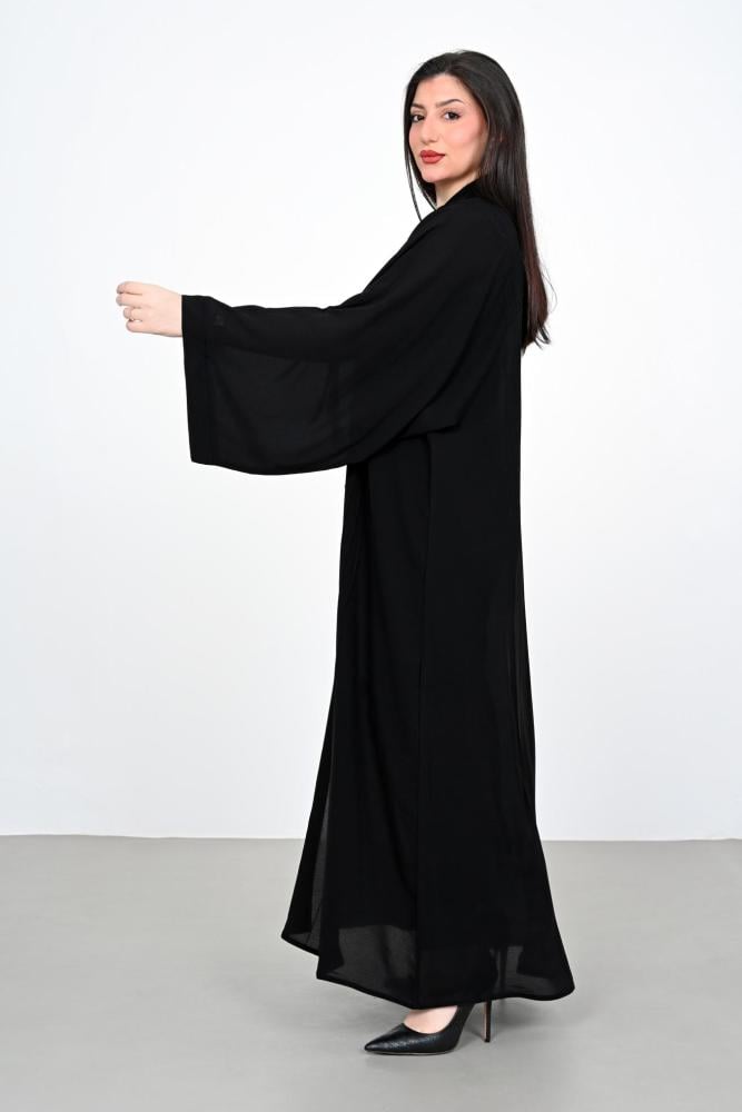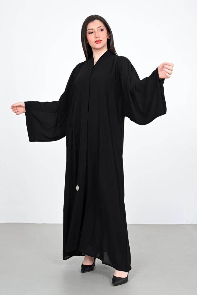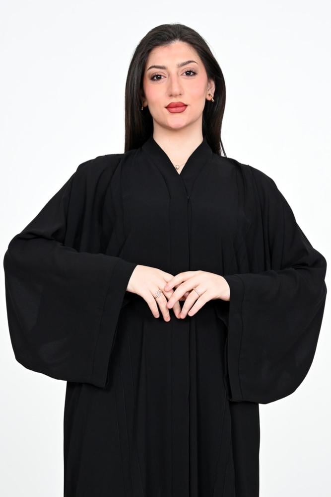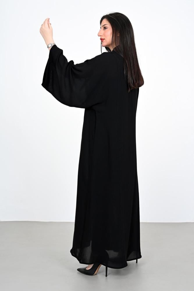 - وصف الموديل; عباية بطرحة ازرار مصنوعة من قماش الحرير الياباني بخطوط بنسات من الامام والخلف