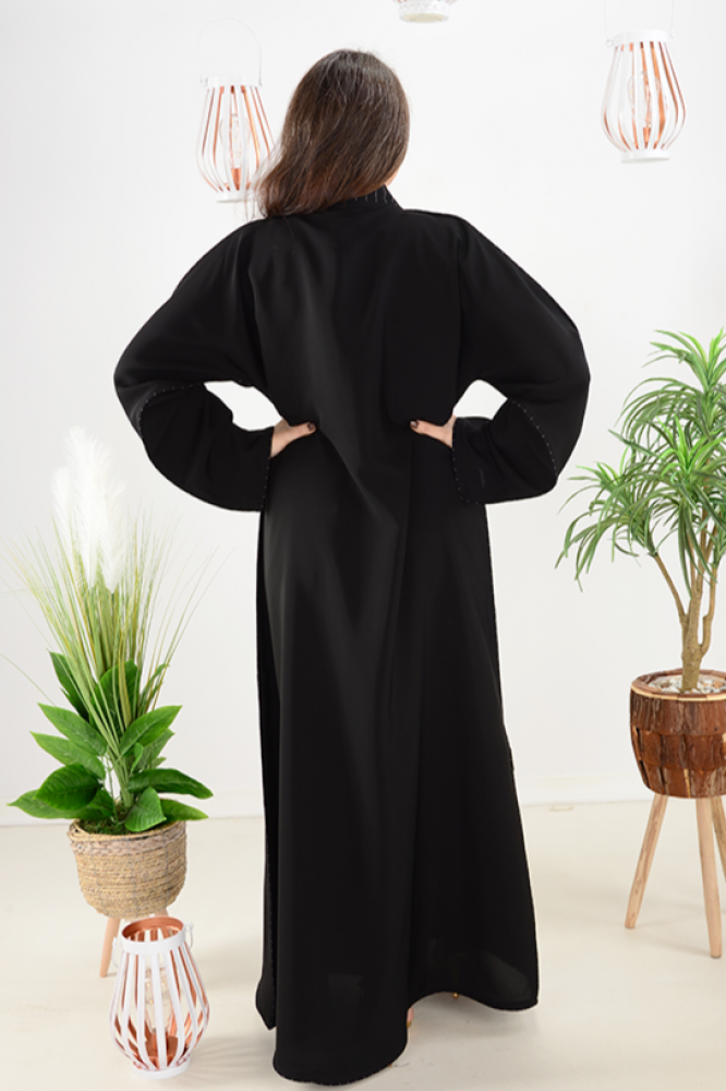 - Model description: A black abaya with its veil made of soft Japanese crepe with one end. Its length is two meters and its width is 75 cm. It comes with front buttons and double-striped fabric with pockets, with defined square sleeves that make you more beautiful.