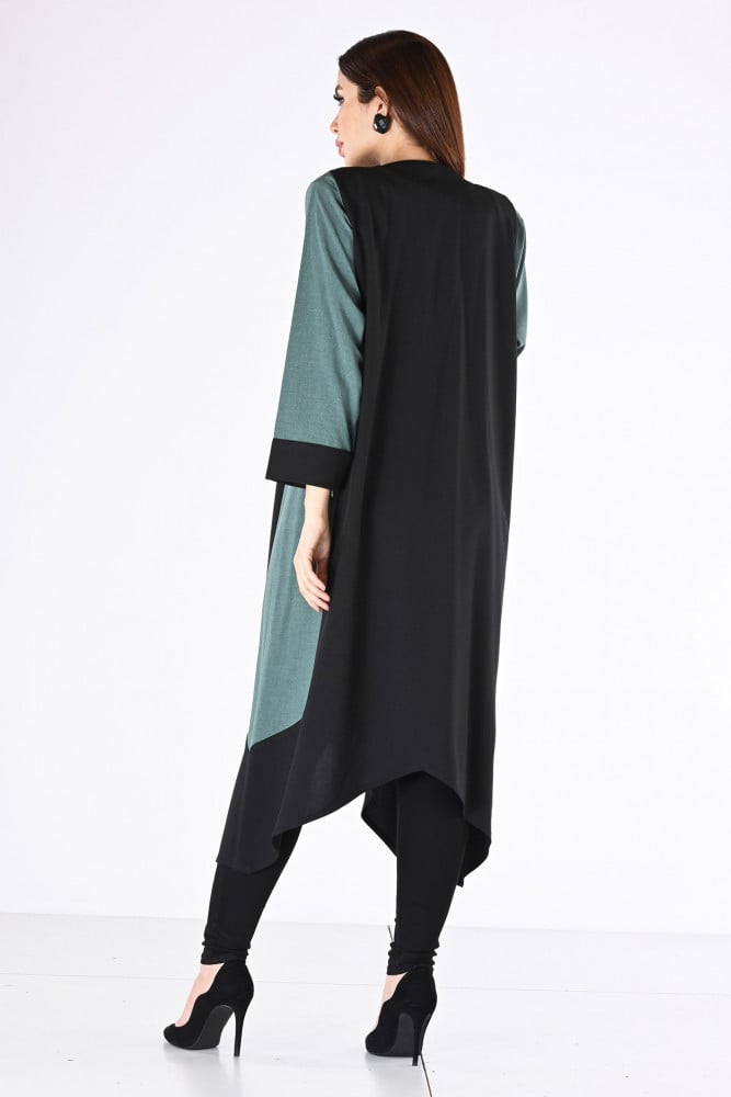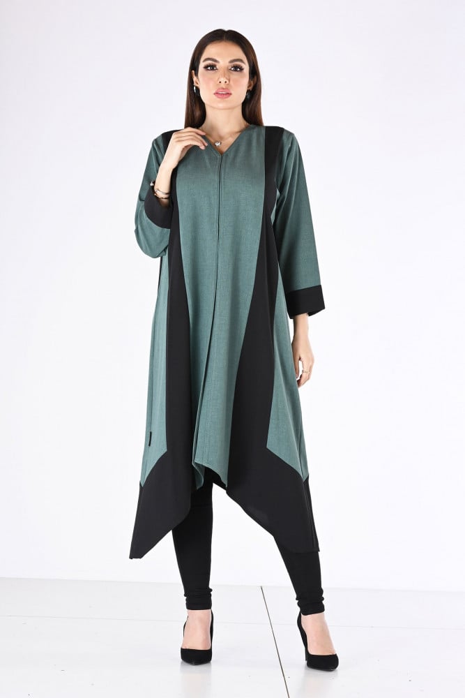 - Model description: Abaya with a veil, buttons in the front, short, with a gradient cut, in apple color, behind a black one