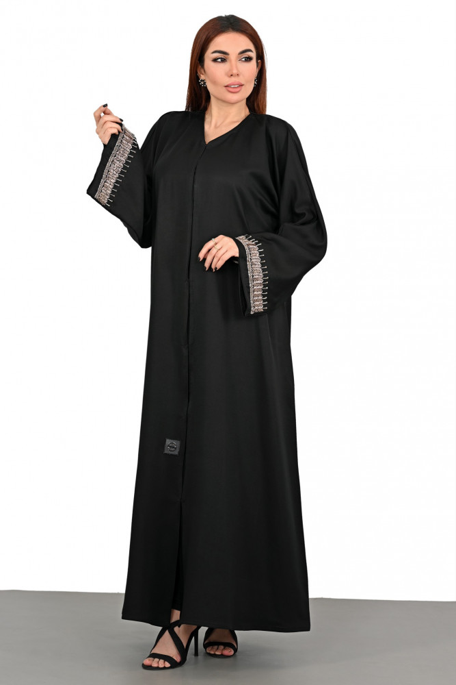 - model description; An abaya with a veil of buttons that comes with a beaded sleeve