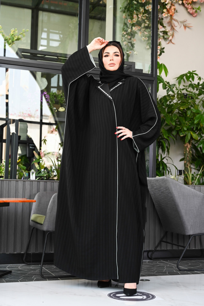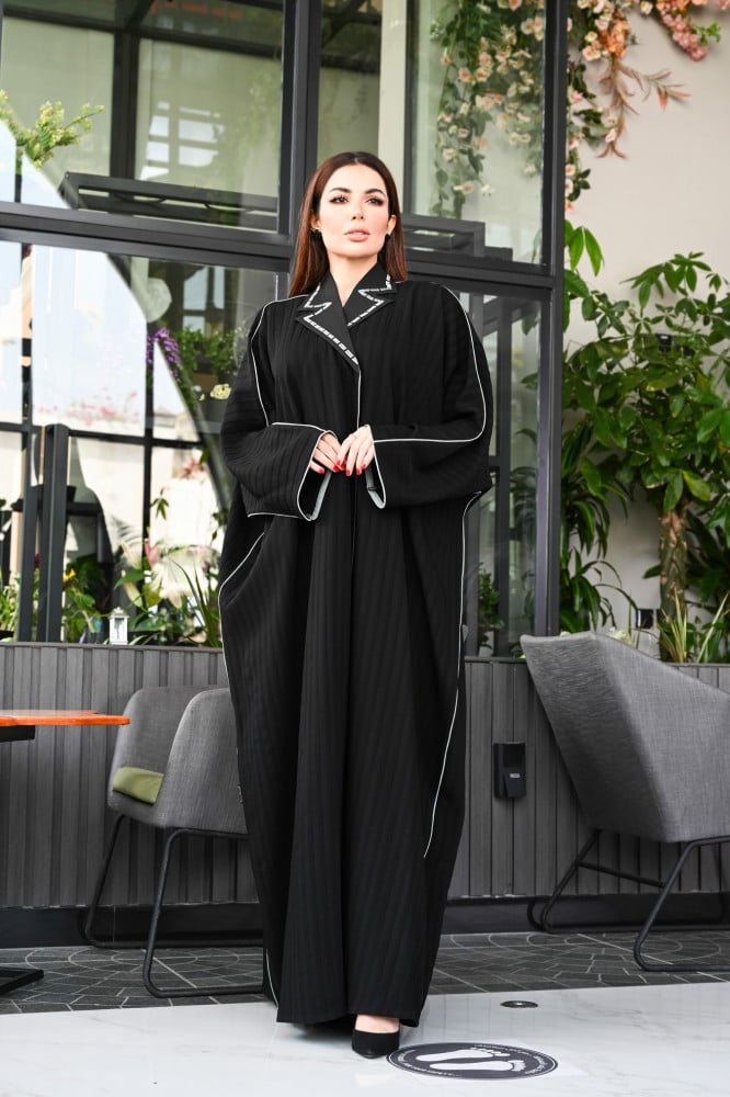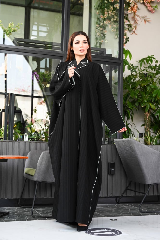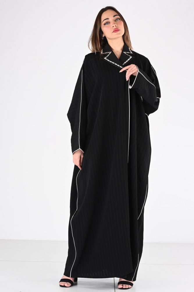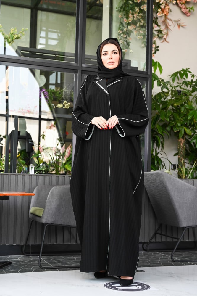 - Model description: Abaya with a wrap veil, it comes with an embroidered cap in cream color, outlined with a frame in front and sleeves
