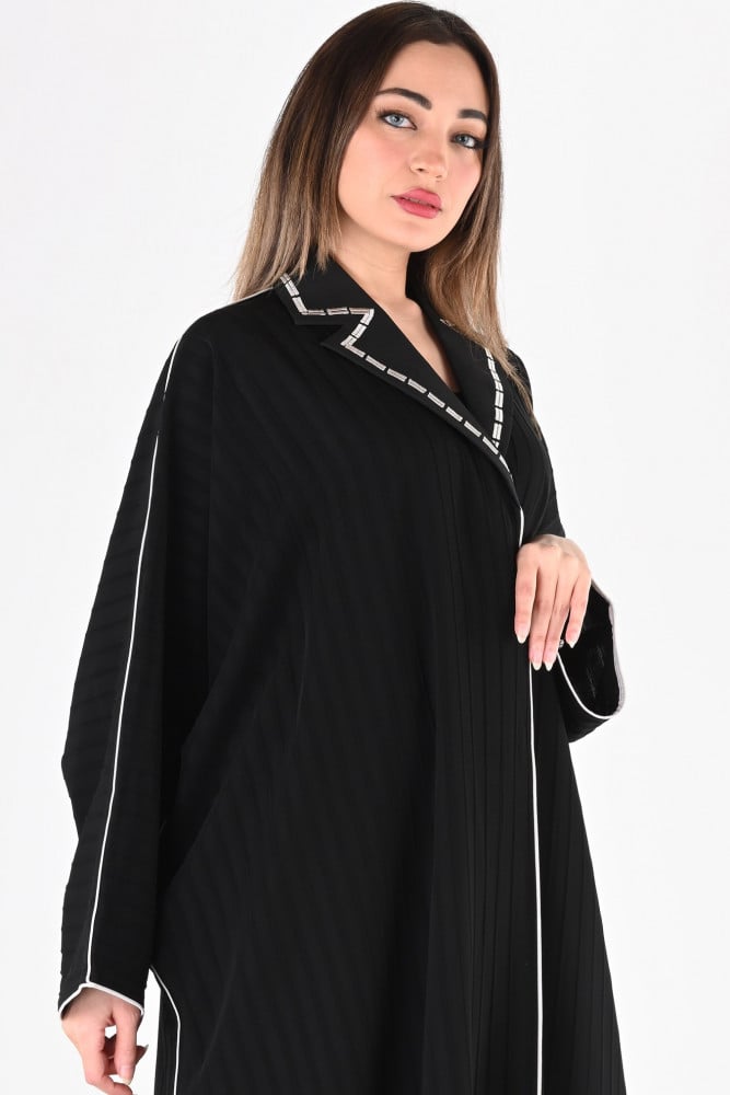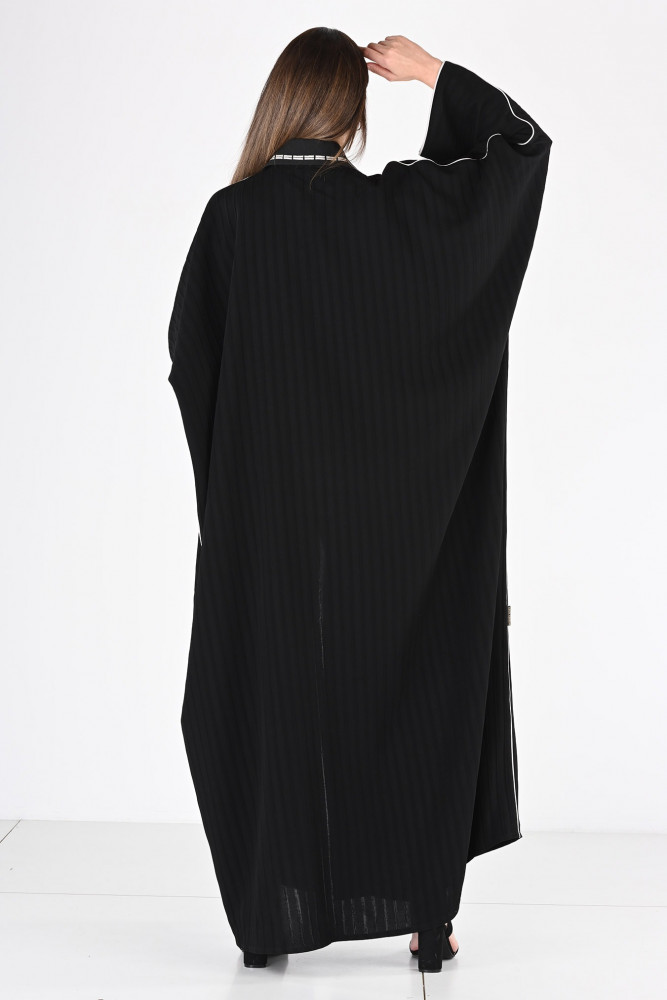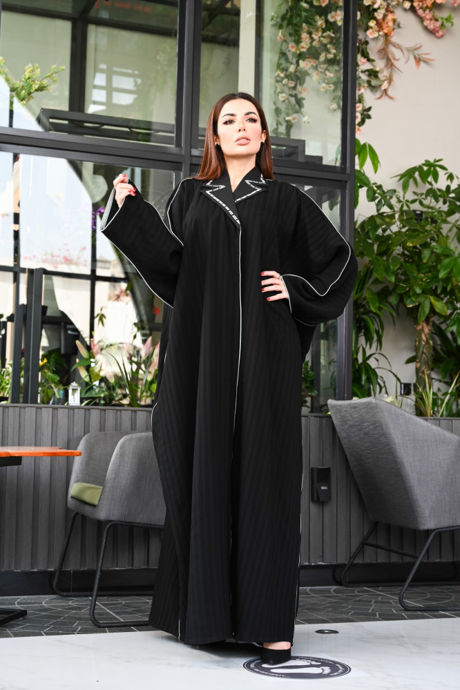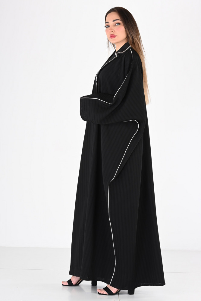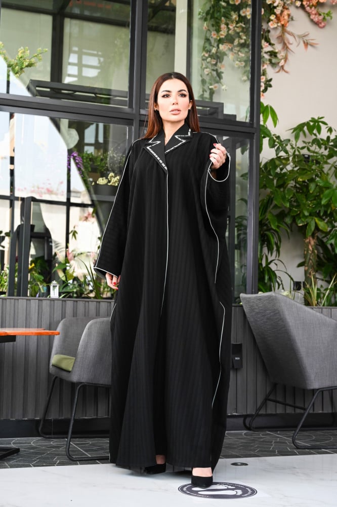 - Model description: Abaya with a wrap veil, it comes with an embroidered cap in cream color, outlined with a frame in front and sleeves