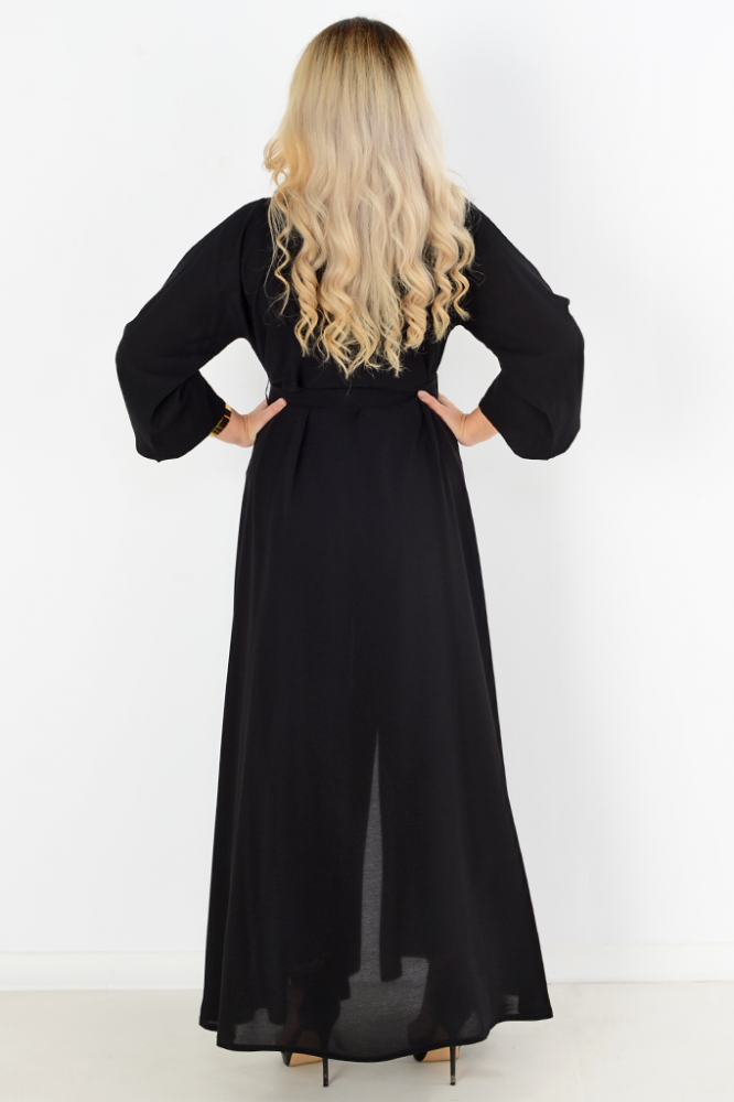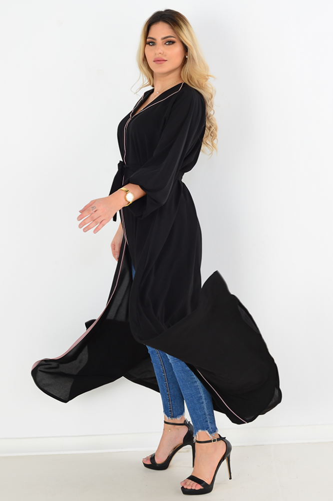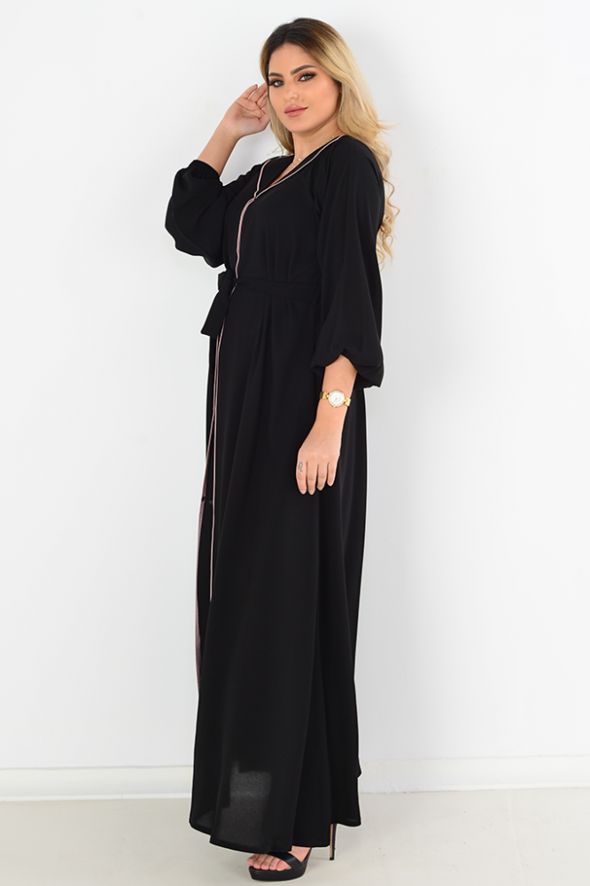 - Model Description: A black abaya with a veil made of soft fabric that comes with two beige stripes on the front and the collar increases your beauty. The abaya comes formally to suit your meetings and work times