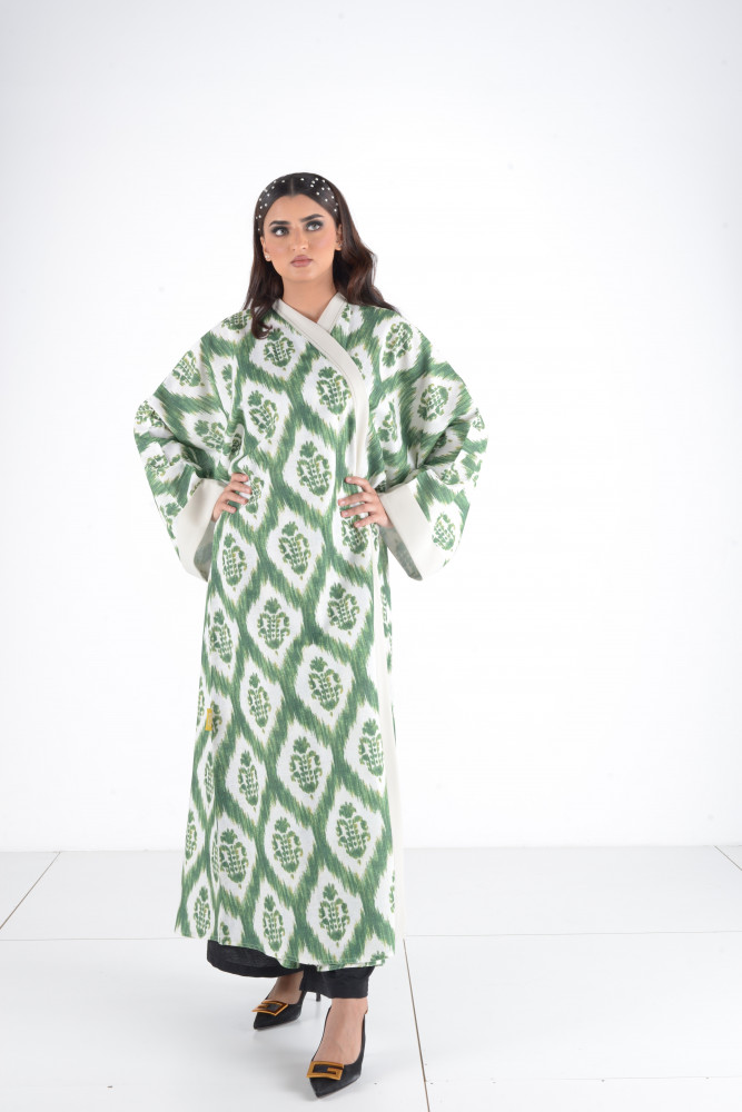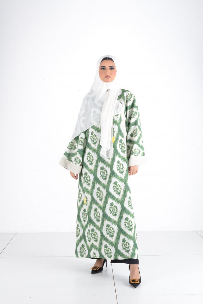 - Model description: Abaya with a wide sleeved scarf in green color