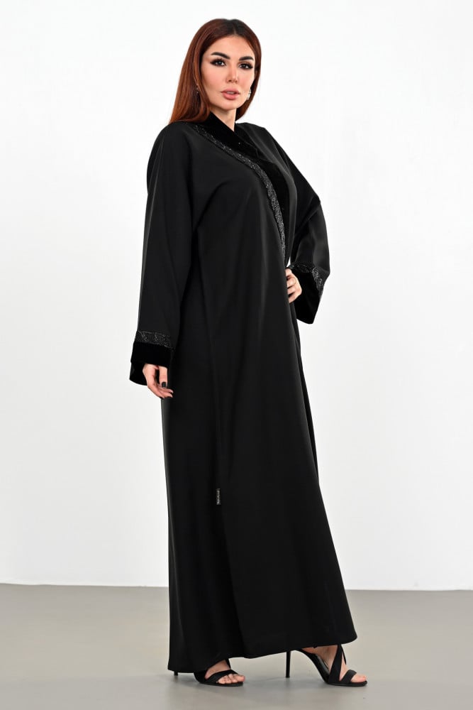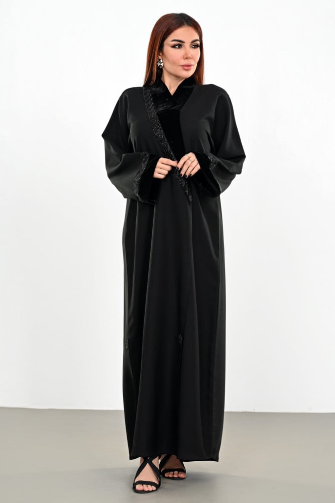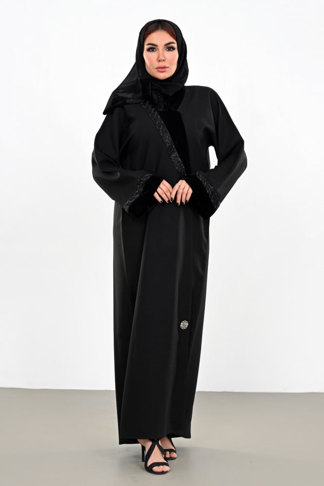 - model description; Abaya with a veil that wraps the collar and a velvet sleeve inlaid with beads