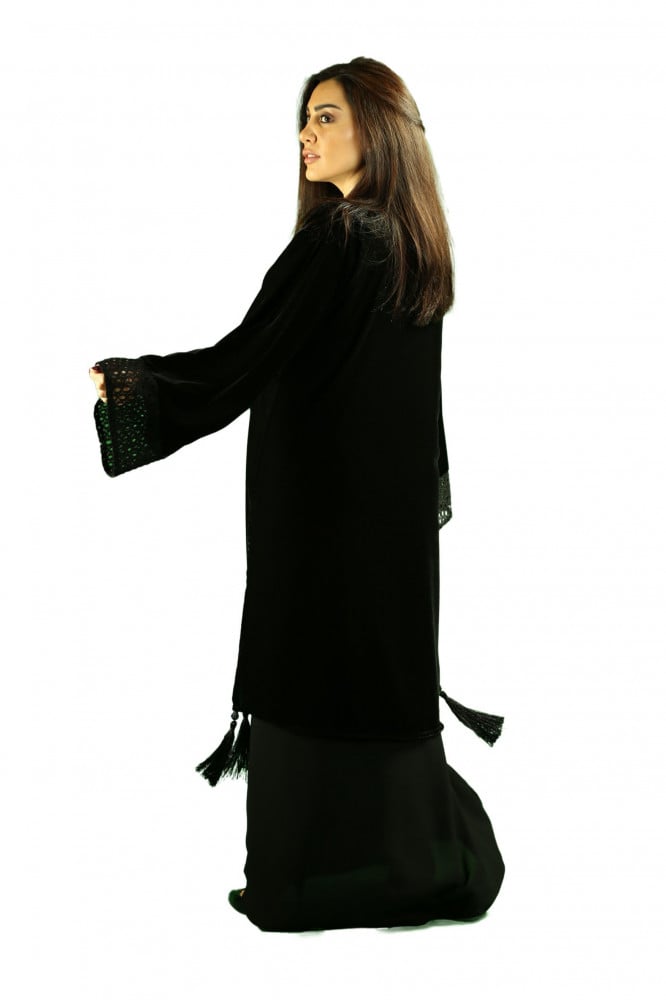 - Model description: A black abaya with its veil made of velvet fabric on a Japanese tiger on an Indonesian one. It has a soft work at the end. The abaya comes with a full front zipper with a velvet layer and an openwork cost in the sleeves that makes it more beautiful. The abaya comes in an attractive shape to suit your evening parties and parties
