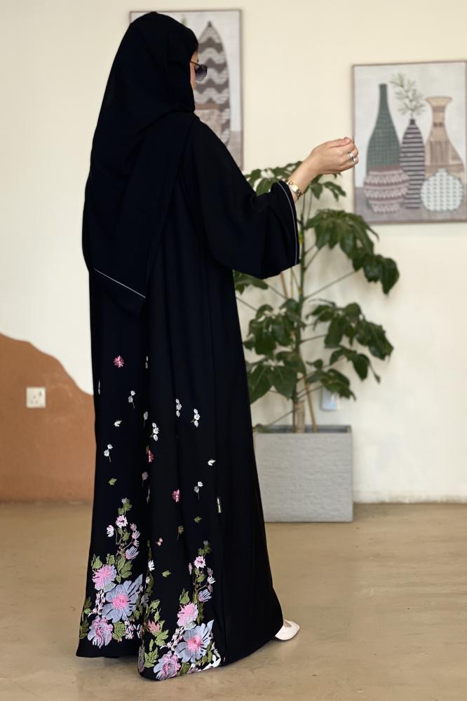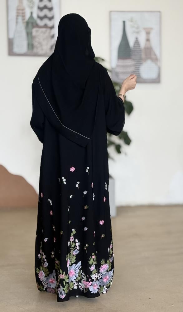 الوصف : عباية بطرحة زرارات خطين قيطان من الامام مع الاكمام تطريز مشجر ورود من الخلف