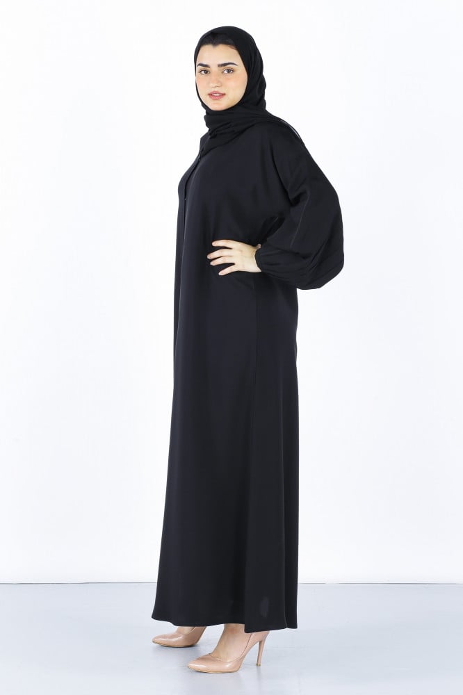 - Model description: A black abaya with its veil made of Japanese crepe, soft at one end, it comes with front buttons, and a small sleeve with pleats that make you more beautiful. The abaya comes formally to suit your meetings and work times.